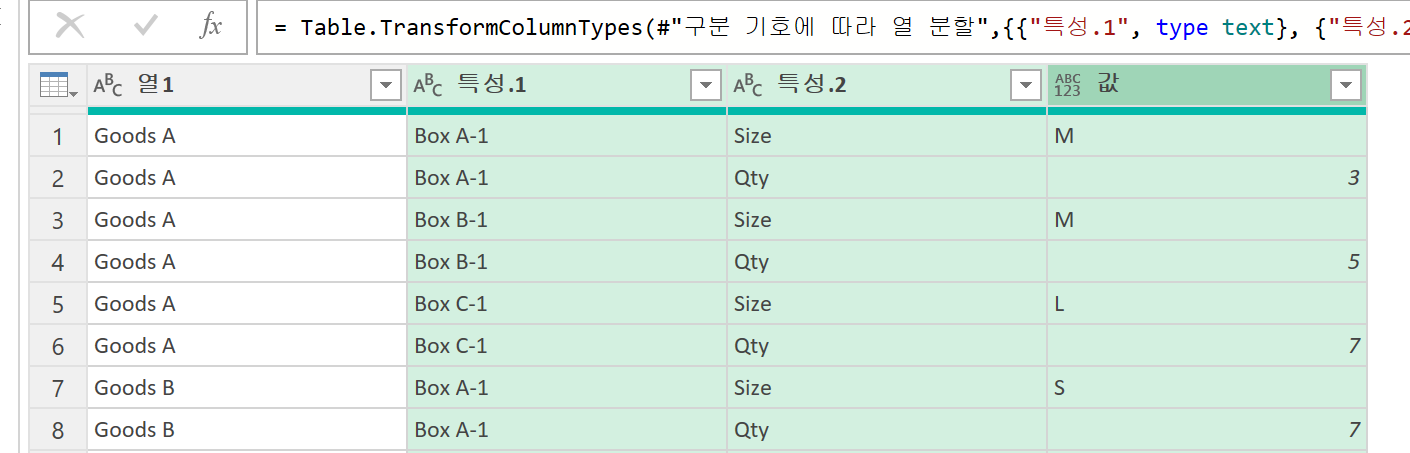 통계된 열 선택 > 피벗 열 해제 > 데이터 전처리(열분할 사용) '특성' 열