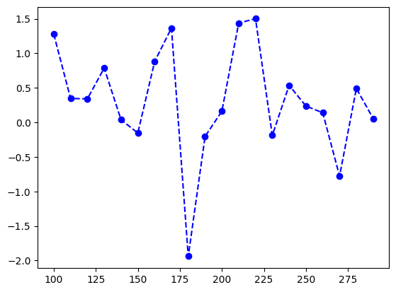 plt.plot(x,y, color='blue', linestyle = '--', marker = 'o')