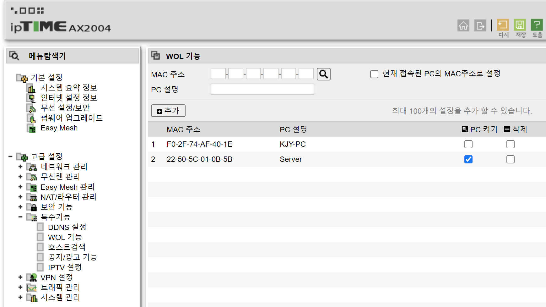 WoL을 실행하는 방법은 여러가지지만 iptime을 활용 예시. 앱도 있으니 핸드폰으로도 가능
