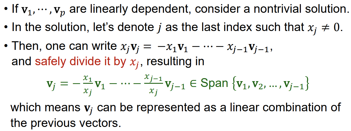 linearly dependence : trivial solution 외 다른 해가 존재 할 경우. (nontrivial solutions 최소 한개 이상 존재)