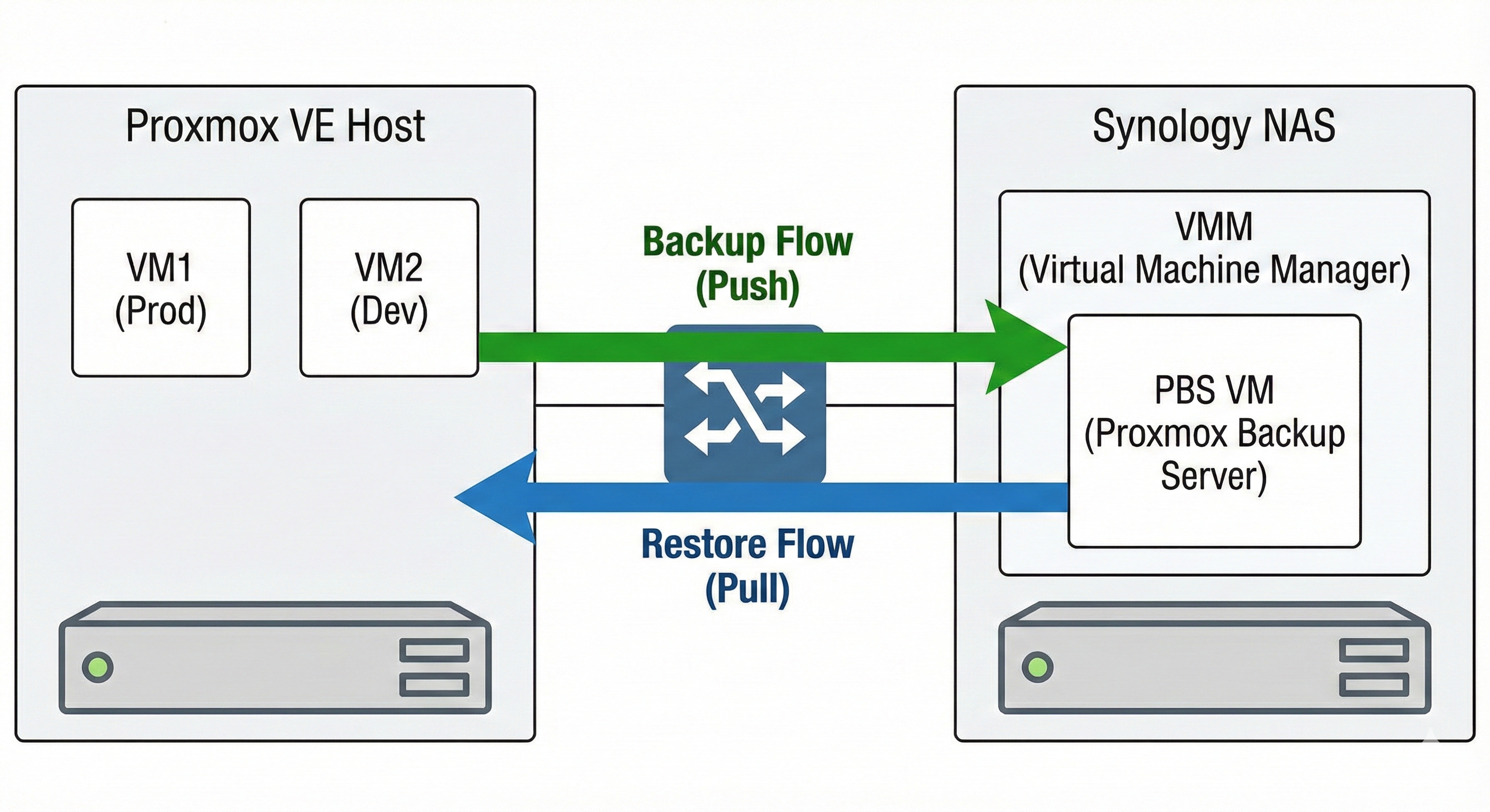 - Backup Server: Synology NAS VMM(Virtual Machine Manager) 위에 설치된 Proxmox Backup Server (PBS)