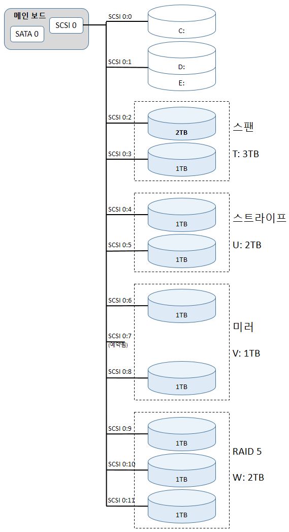 비어있는 SCSI 0:2에 2TB 하드디스크를 장착하고, SCSI 0:3~11(7 제외)까지는 모두 1TB의 하드디스크를 장착합니다.(실습에서는 GB 단위) 또, [그림 4]와 같은 환경으로 T:, U:, V:, W: 드라이브를 설정합니다.