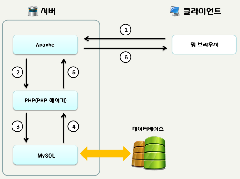⑤ PHP는 데이터베이스에서 가져온 데이터와 PHP 코드를 모두 HTML 형태로 변경한 다음, 해당 HTML 파일을 Apache에 전달한다.