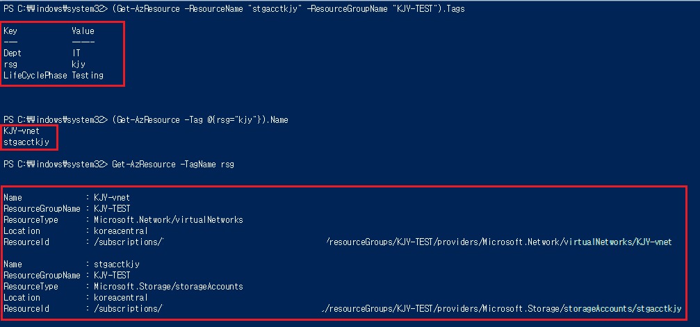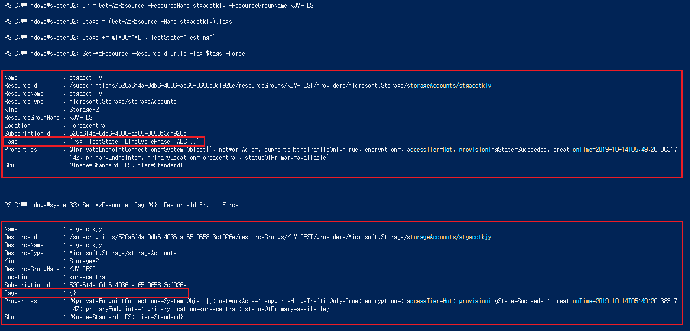 (Get-AzResource -ResourceName "stgacctkjy" -ResourceGroupName "KJY-TEST").Tags