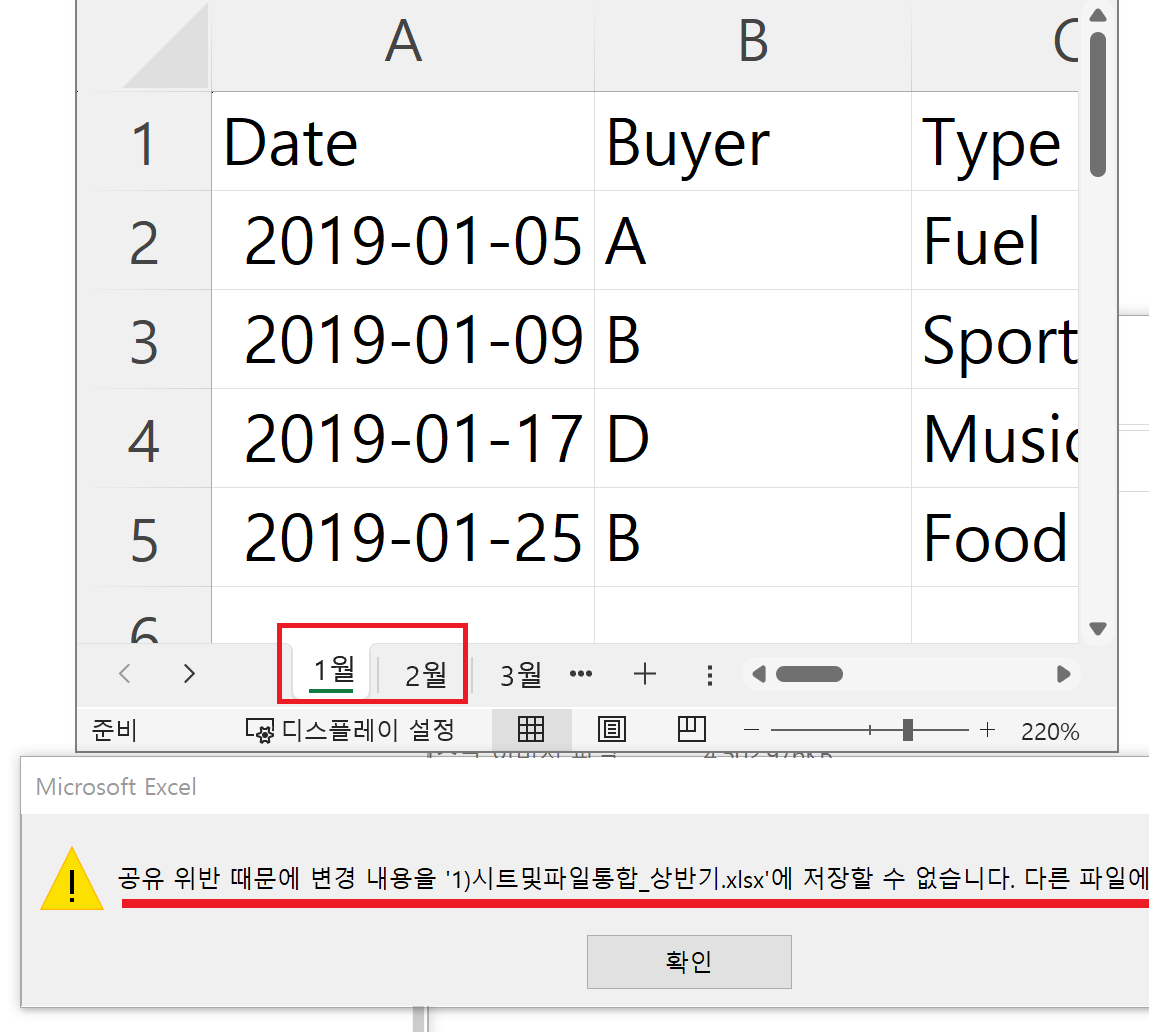 데이터(시트)가 추가 되 경우 대상 파일을 업데이트 하고 목적파일을 새로고침하면 된다. 근데 목적파일이 열려있는 경우 대상파일 저장 할 때 '공유 위반' 오류 발생될 수 있다.