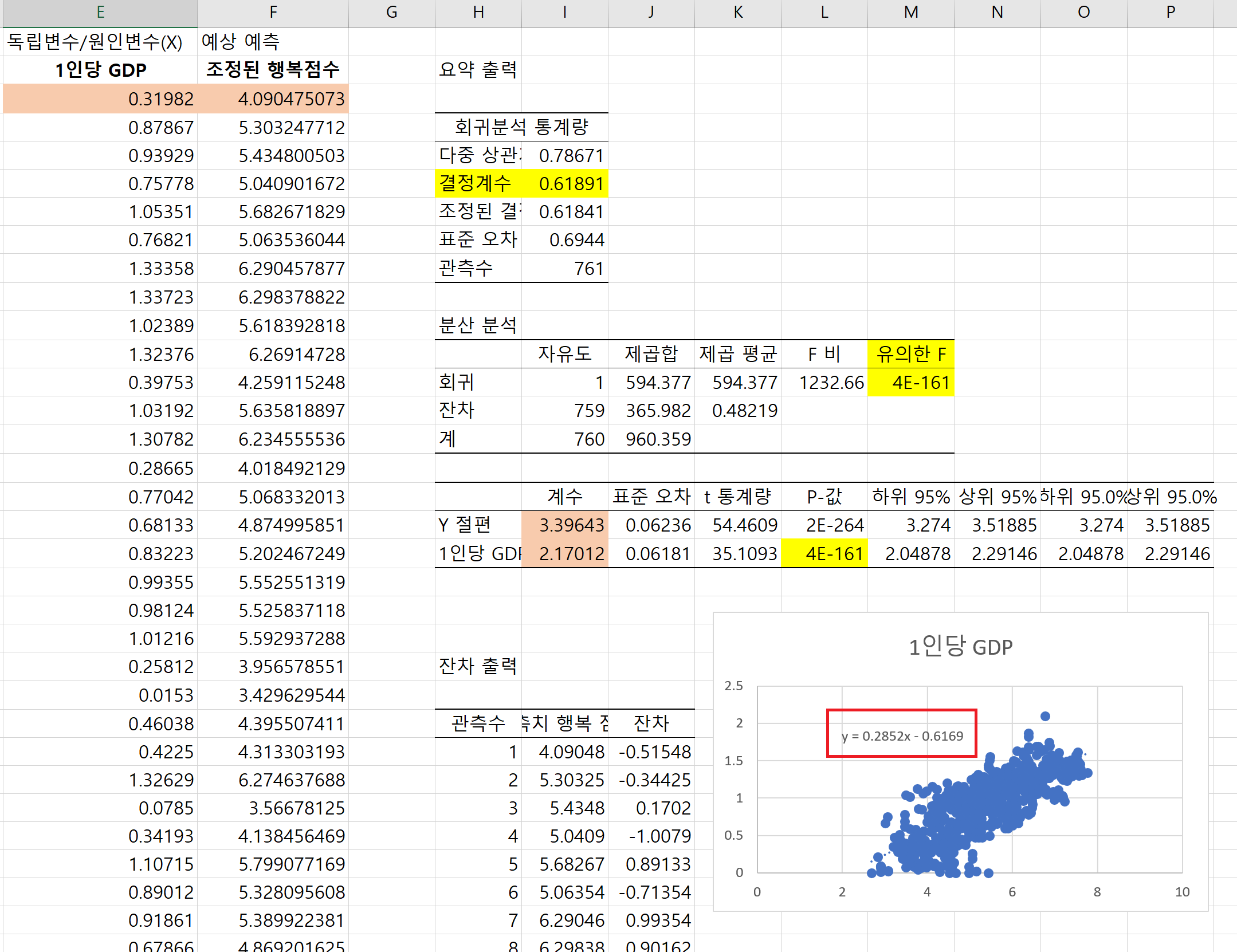 예측치 행복 점수 엑셀수식 : =$L$19*E3+$L$20*F3+$L$21*G3+$L$22*H3+$L$18