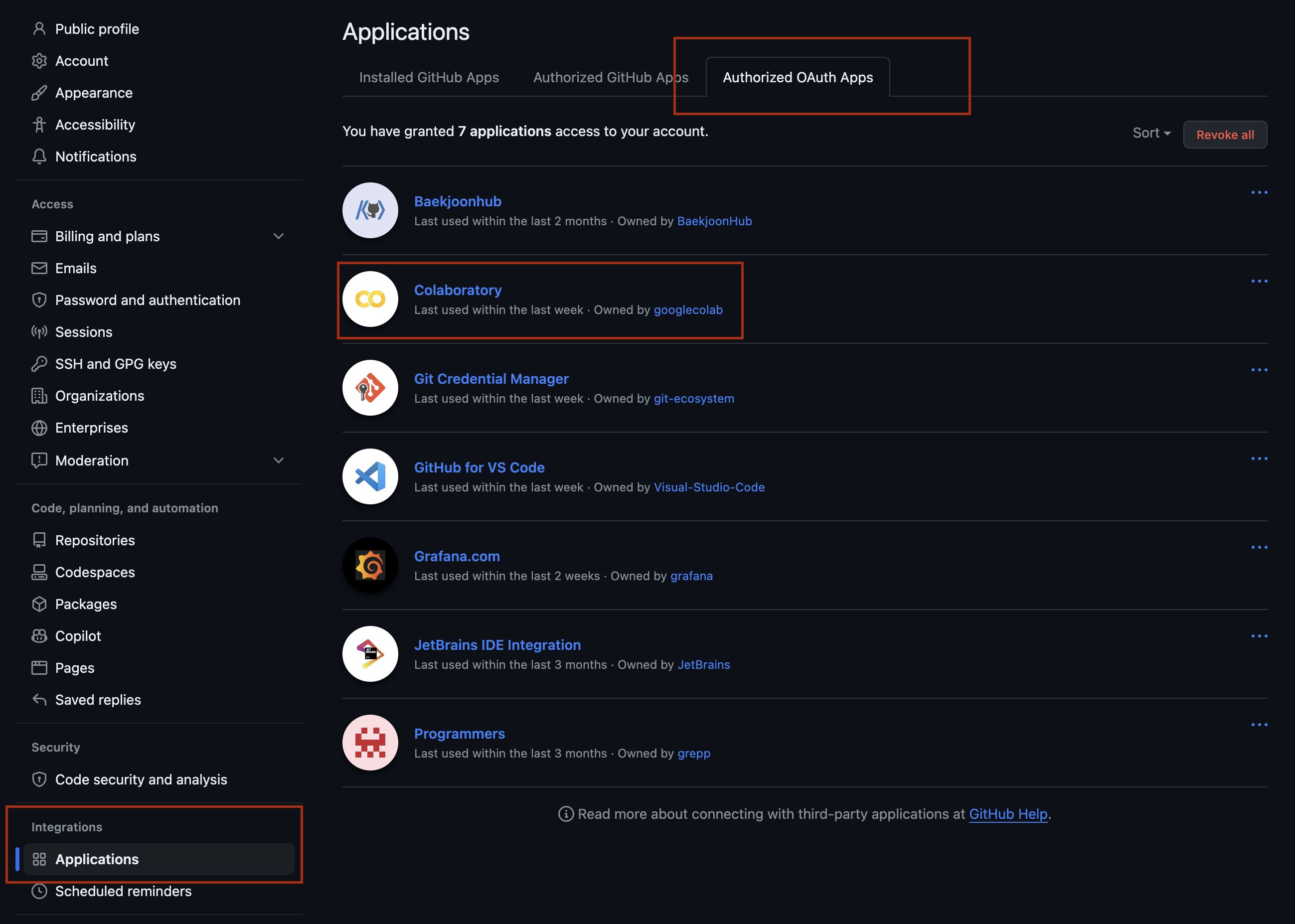 순서 : Organization - Setting - Applications - Authorized OAuth Apps